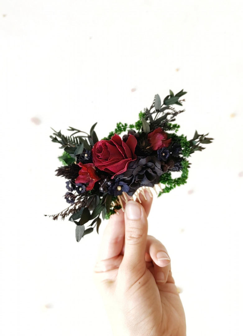 Autumn bridal hair comb in burgundy, black and green tones...