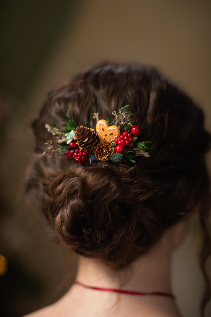 Christmas/winter flower hair comb and hairpins. With berries, pine cones and gingerbread.