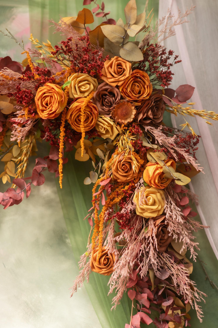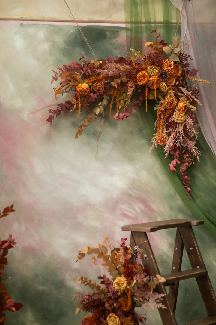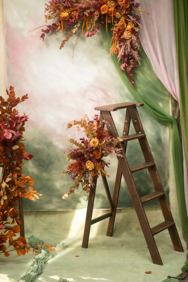 Boho wedding arch floral decorations made from artificial flowers and preserved materials. Two sizes - small or large