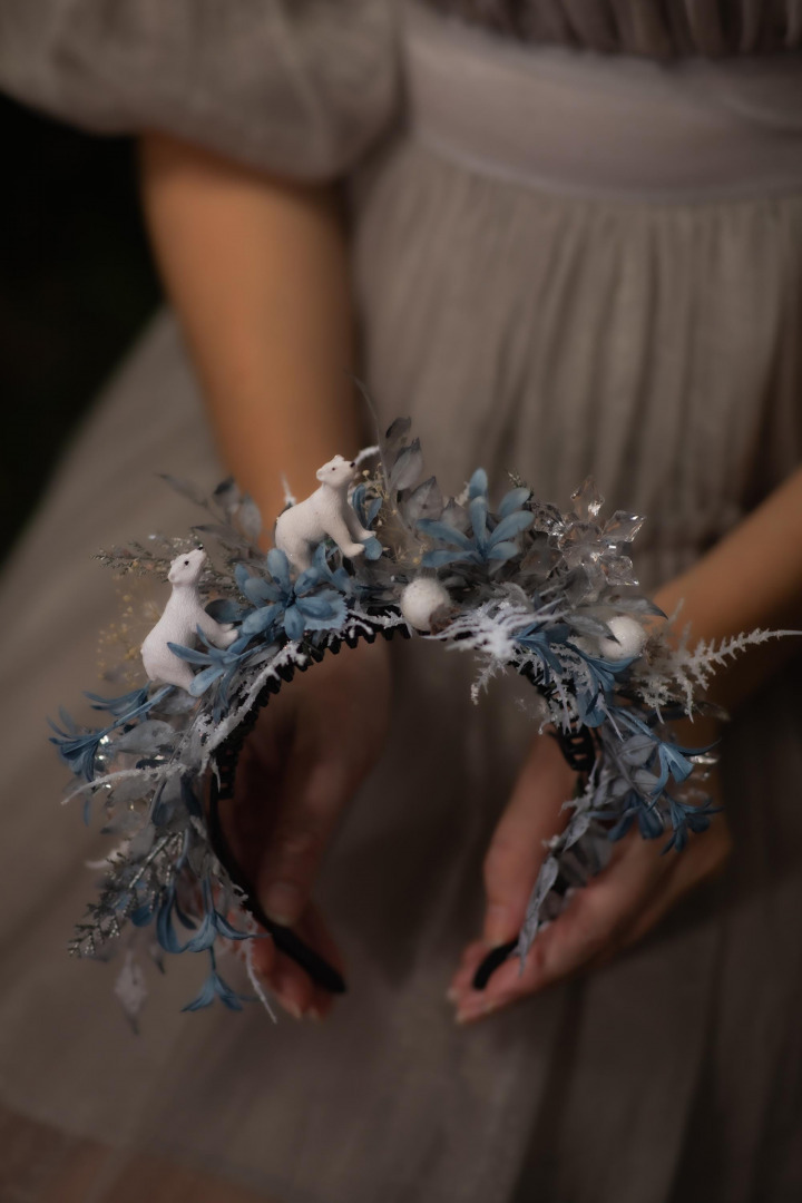 Čelenka je vyrobená z umelých aranžérskych drobností, konzervovaných materiálov, medveďov a iných drobností určených k aranžovaniu.