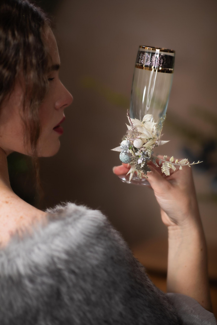 Kvetinové aranžmány na poháre,určené na slávnostný prípitok.Vhodné predovšetkým na svadbu,ale aj na narodeninovú oslavu či iné slávnostné stolovanie.Tieto aplikácie sú trvácne a môžete ich využiť aj po svadbe.Drobný konzervovaný materiál môže opadávať.Vhodné na svadby(rustikálna svadba,boho svadba,greenery svadba,vianočná svadba, svadba v stodole či na záhrade),narodeninové oslavy či iné špeciálne príležitosti.