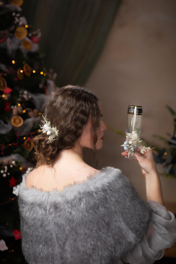 Ozdobte svoje vianočné alebo silvestrovské poháre našimi ozdobami. Dajú sa prichytiť na akúkoľvek stopku pohára. Vyrobené sú z umelých a konzerovaných materiálov,lístkov eukalyptu, trávy, drôtiku, floristickej pásky a iných drobností určených k aranžovaniu.