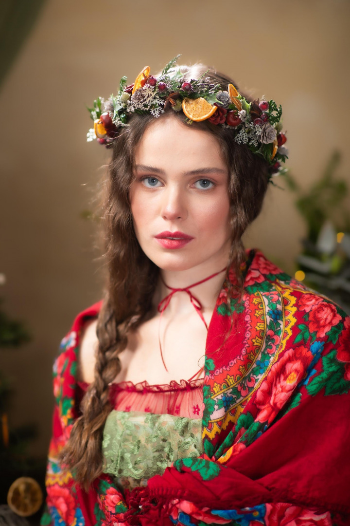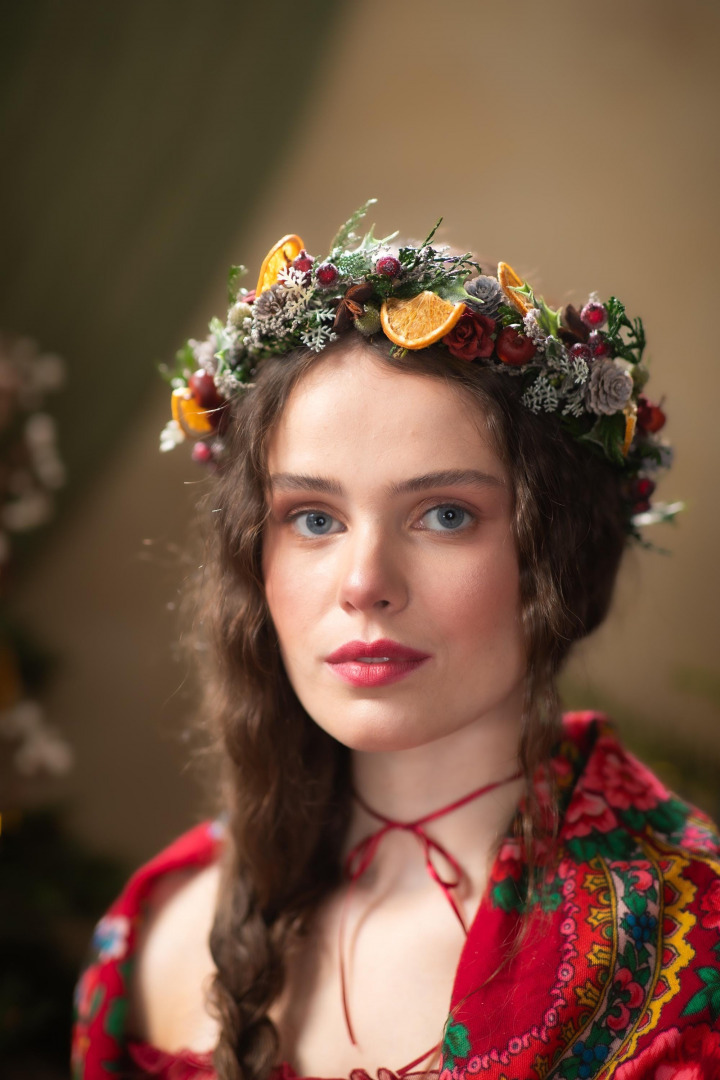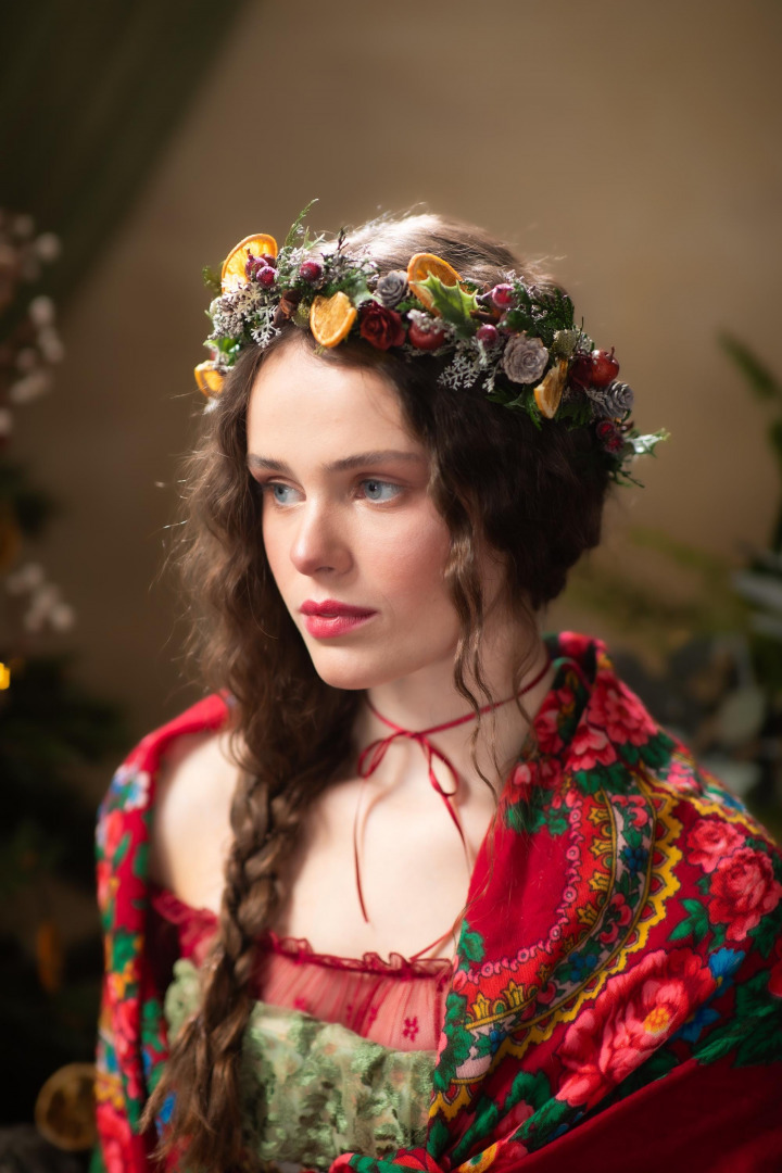 Hair wreath is made of artificial material, natural material and other arrangement trinkets.