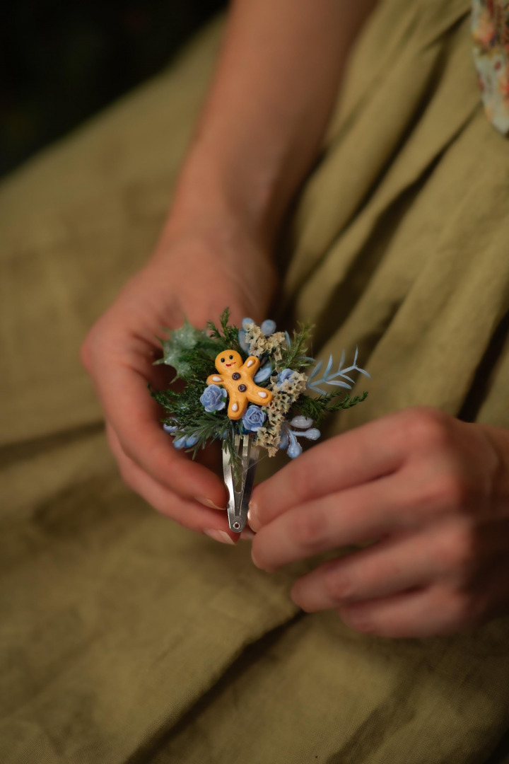The hair clip is made of artificial and preserved material, flowers, leaves,... and other arranging material.