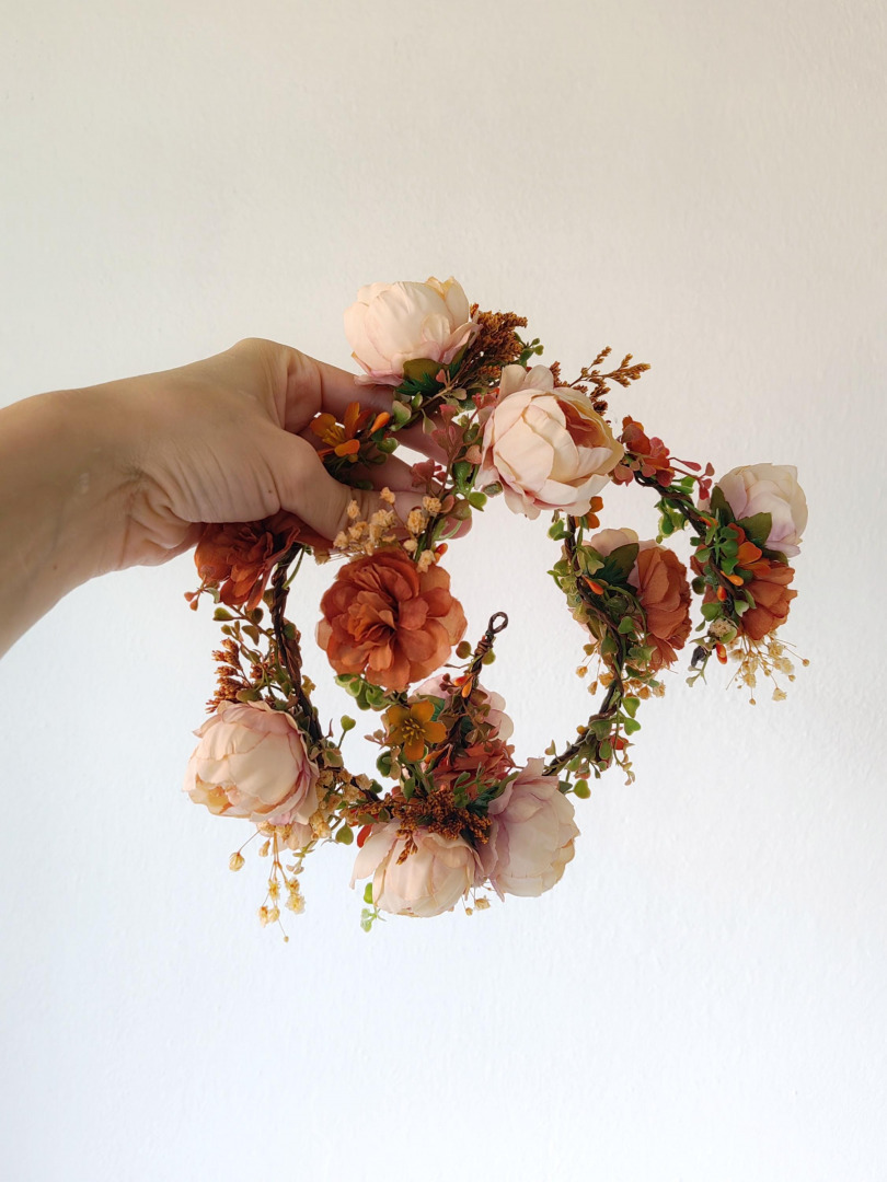 Romantic wedding hair garland in autumn design. Terracotta and blush tones
