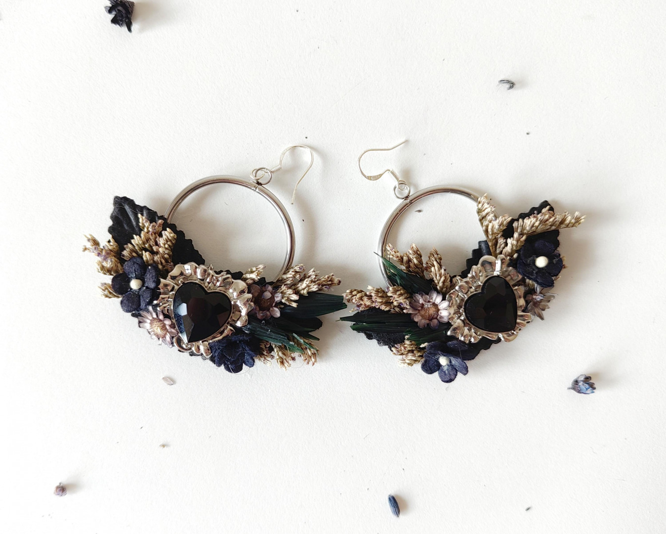 The earrings are made of artificial flowers, preserved material, hearts and other arranging material.