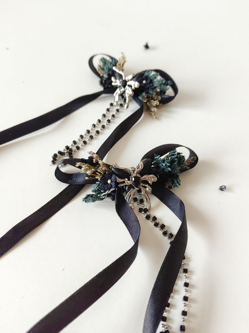 Made of preserved materials, chains, spiders and other trinkets used for arranging.