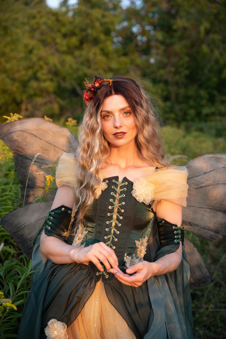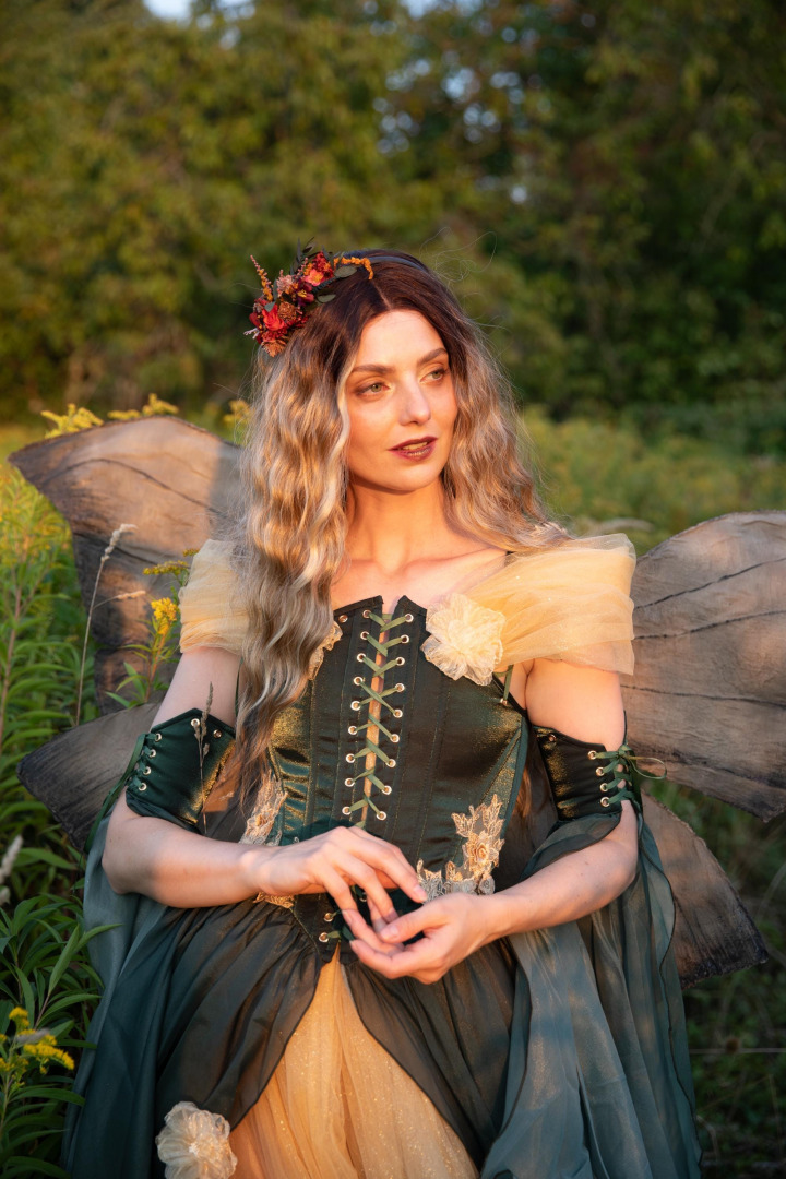 Čelenka je vyrobená z textilných kvetov, konzervovaných lístkov, trávy a iných drobností určených k aranžovaniu...