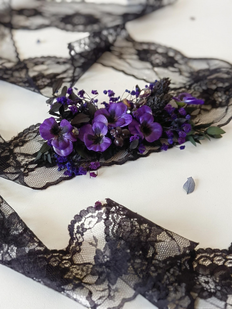The flower belt is made of artificial/fabric flowers, preserved materials, lace and other trinkets used for arranging.