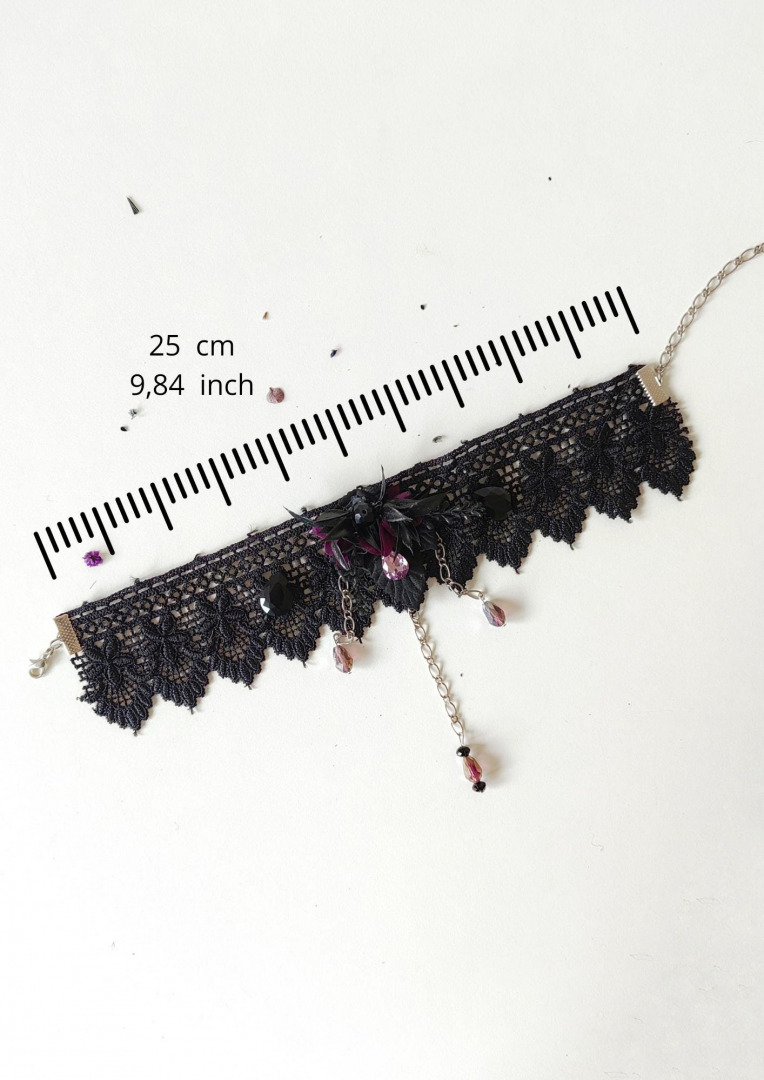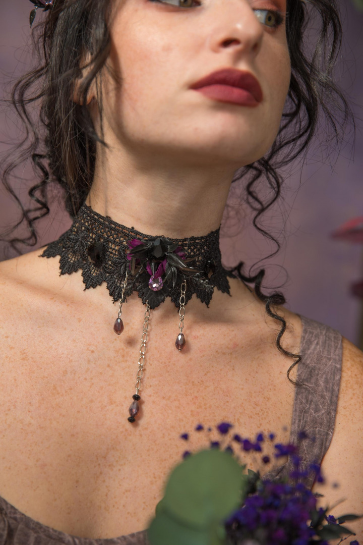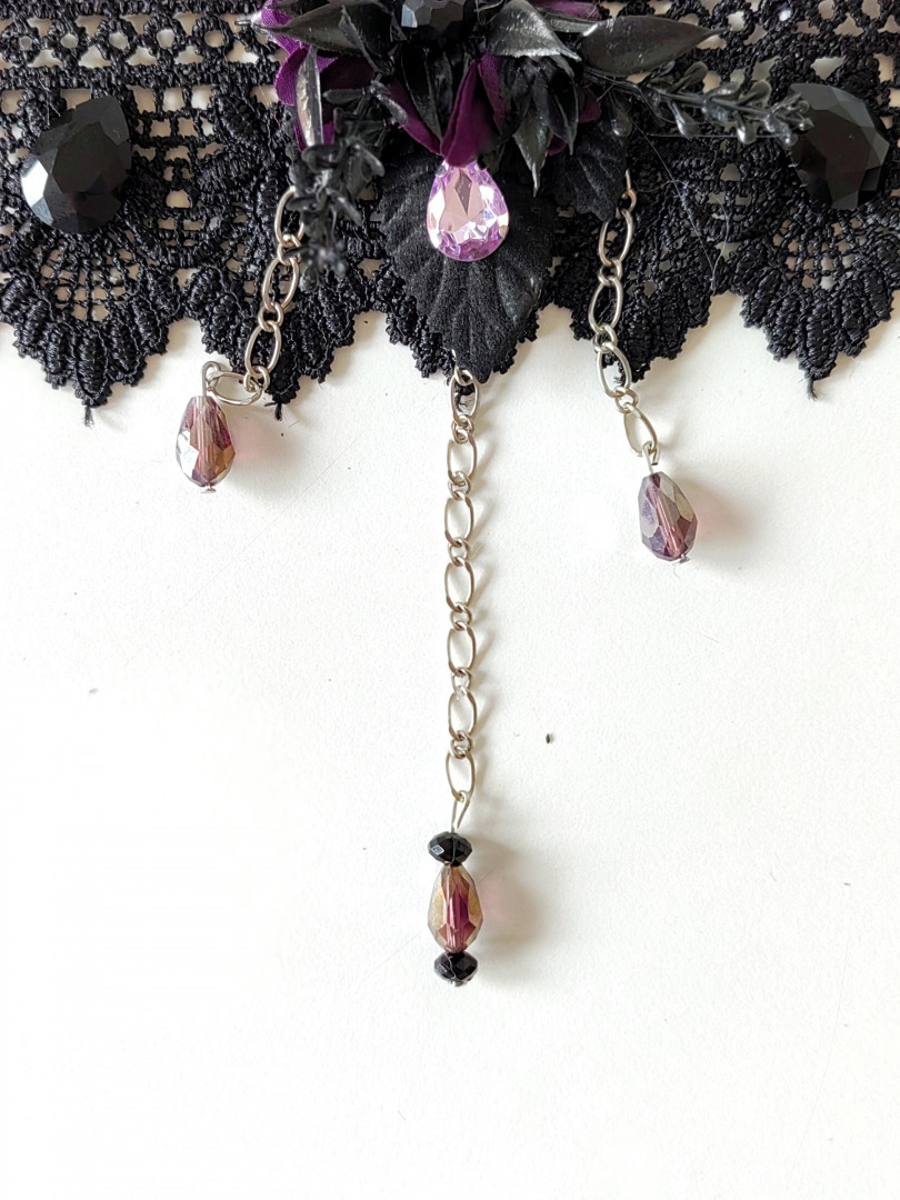Choker necklace with purple flowers, black lace, chains and beads. Suitable for Halloween or gothic wedding