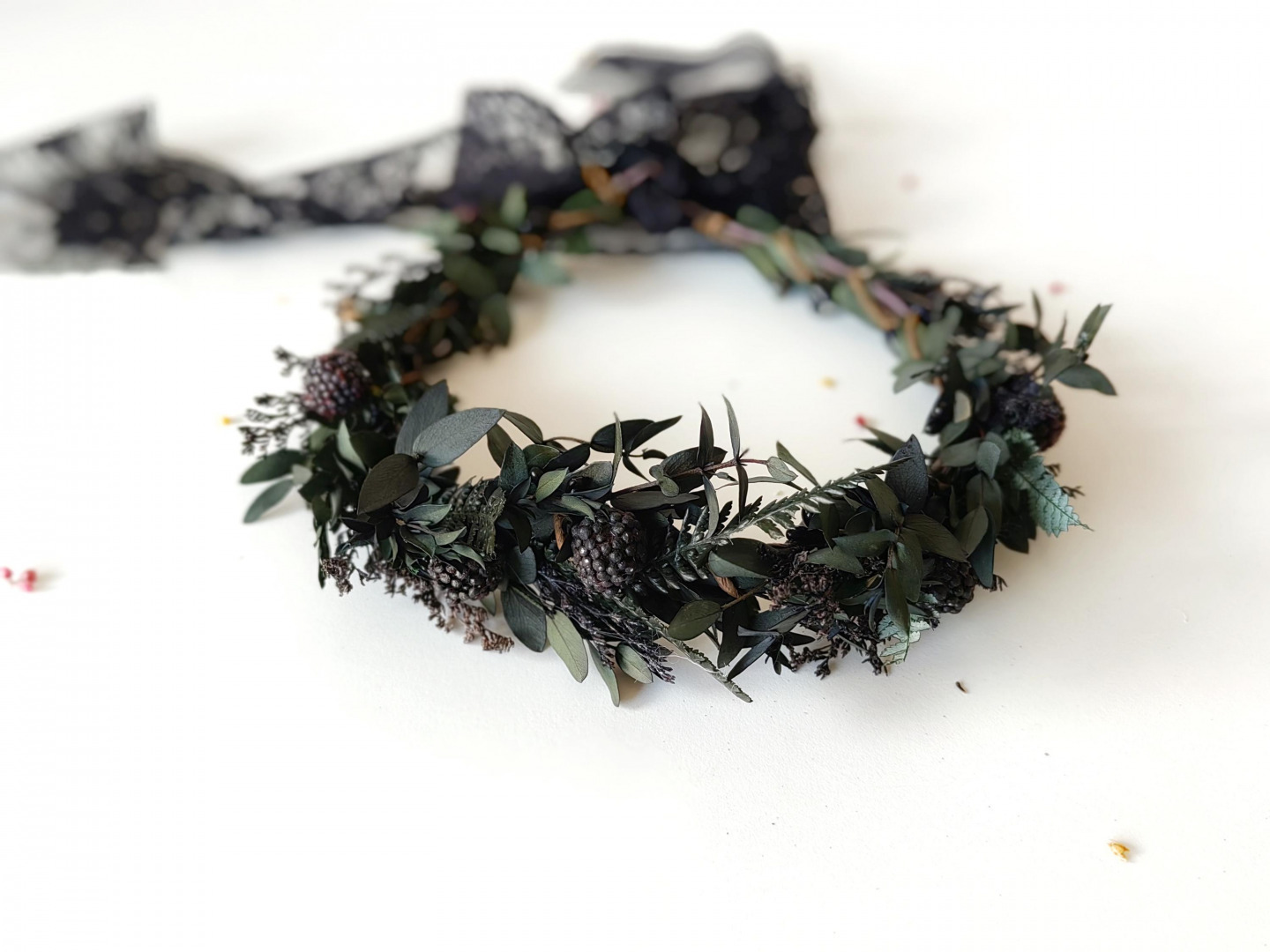 Boho flower hair wreath in green and black tones with black berries...