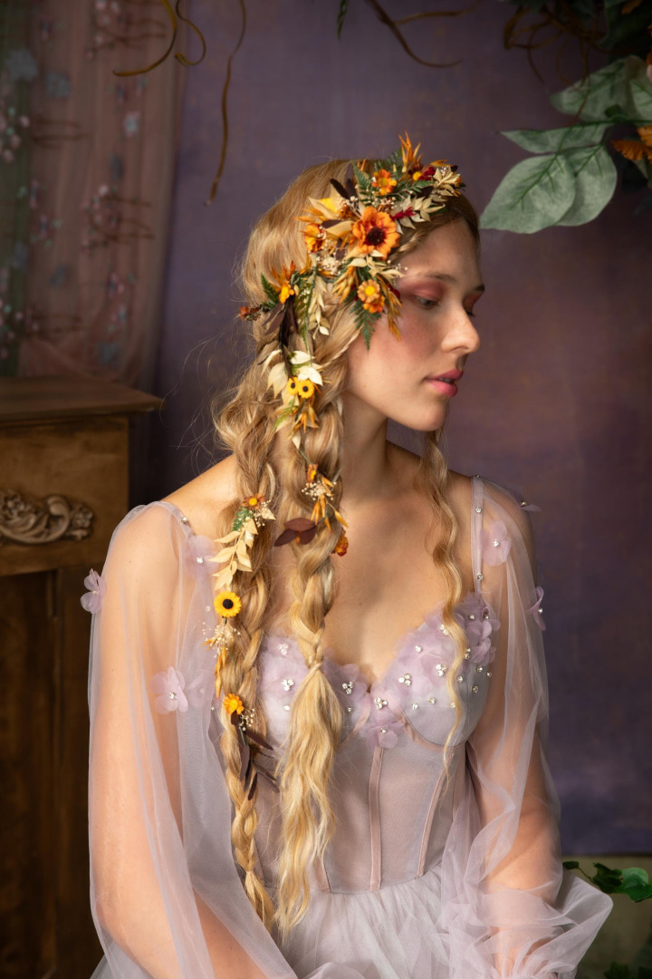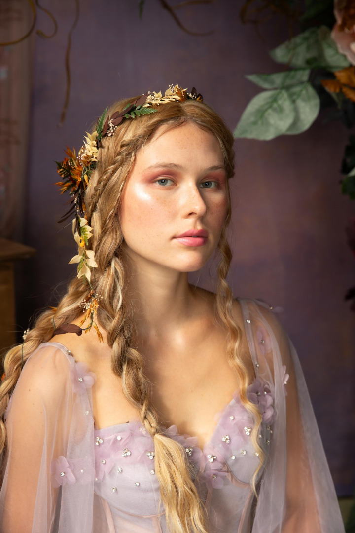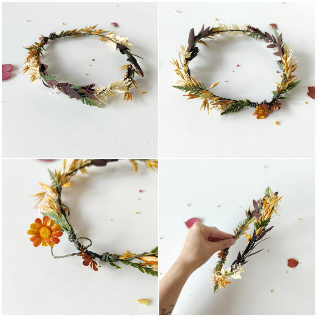 The way to wear the flower set: put on the hair wreath and wrap one end of the wreath around the other to hide the fastening at the back, attach alligator hair clip at the back on the hair wreath, attach the clips/long vines below the alligator hair clip :) The length of the vines/clips is 2x 25 cm (9.84 inches) and 30 cm (11.81 inches)