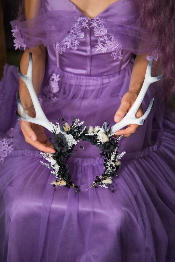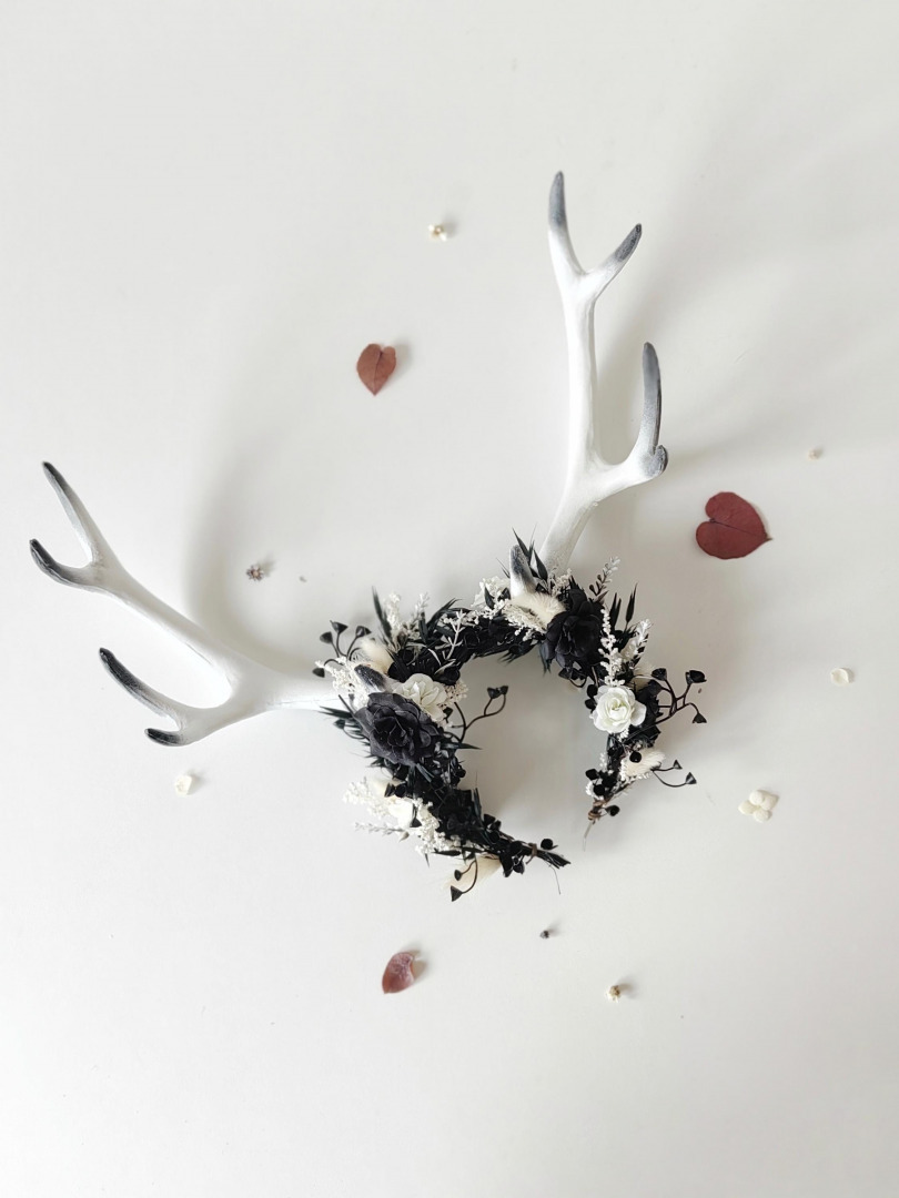 The flower crown is made of artificial and preserved materials, antlers and other arranging material.