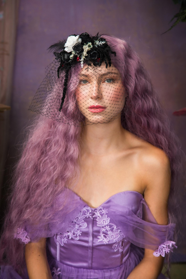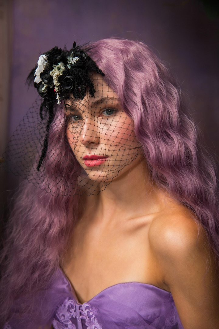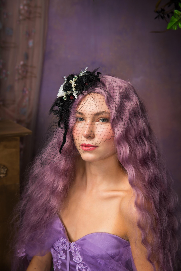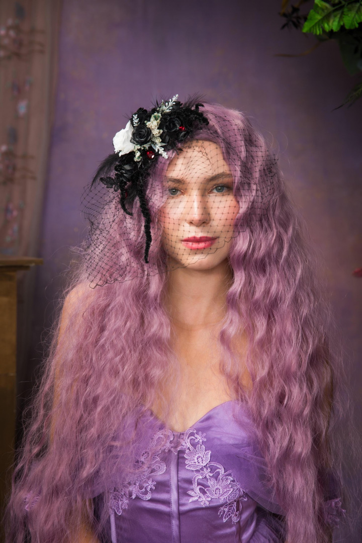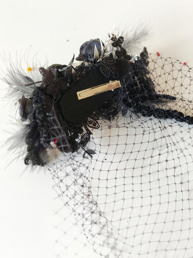 Fascinator is made from artificial and preserved material and veil. Elegant headpiece handcrafted with love.