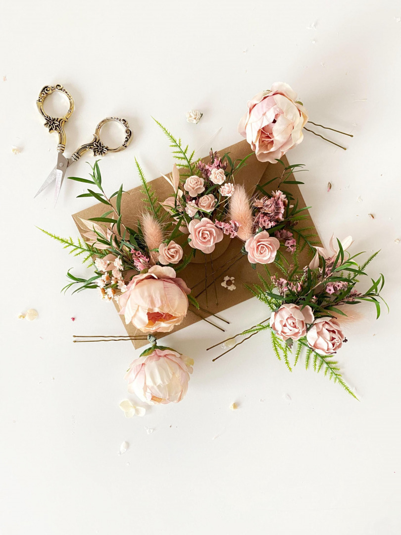 Flower blush hairpins. Perfect for weddings, other celebrations or everyday look. The hairpins are made of artificial flowers, preserved materials, grass and other trinkets used for arranging :)When stored in dry and dark place, our ...