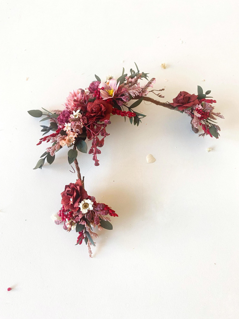 Matching hair clip/vine: https://www.etsy.com/uk/listing/1878918432/burgundy-hair-clip-burgundy-boho-hair