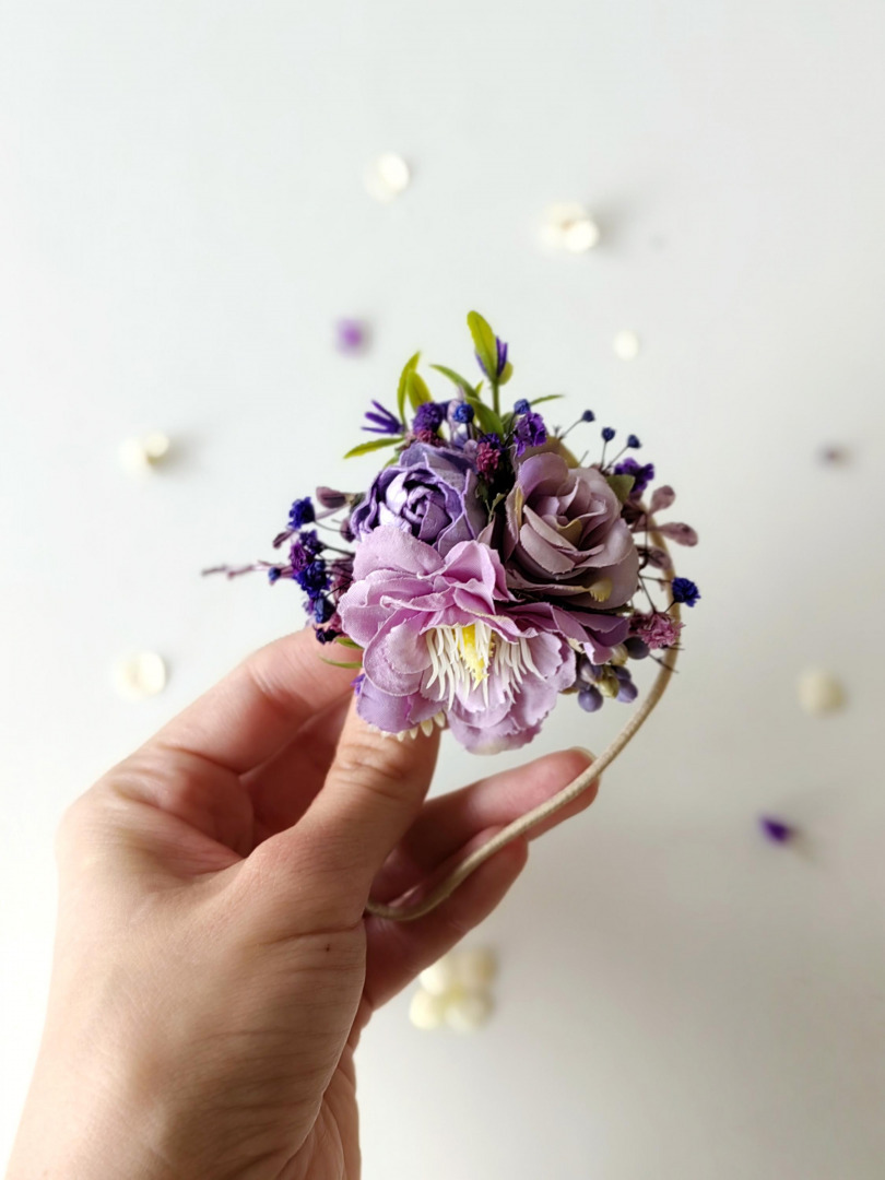 Romantic flower hair tie in purple tonesThe flower hair tie is made of artificial flowers, leaves, grass, preserved material and other trinkets used for arranging. Photo: Michaela durisova photographyModel: Mix model managementWhen ...