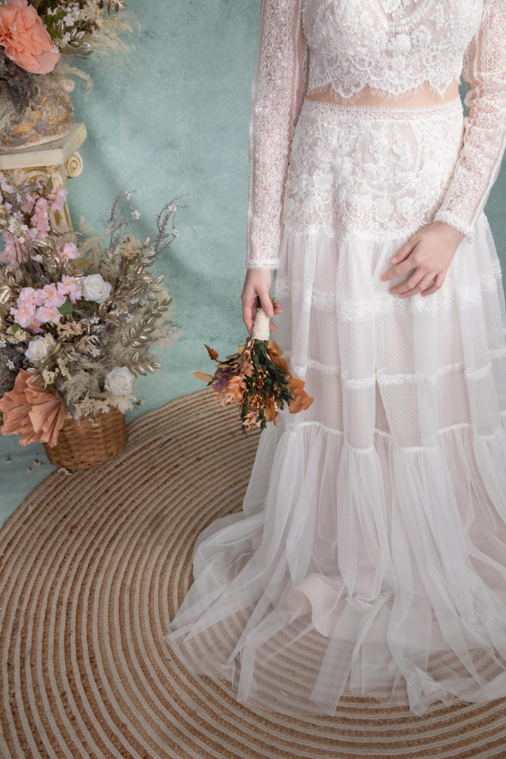 Svadobná boho kytica z umelých a konzervovaných materiálov. Životnosť kytice je pri správnom skladovaní a starostlivosti 10-15 rokov (viac sa dozviete v sekcii STAROSTLIVOSŤ). Kyticu nikdy nedávajte do vody