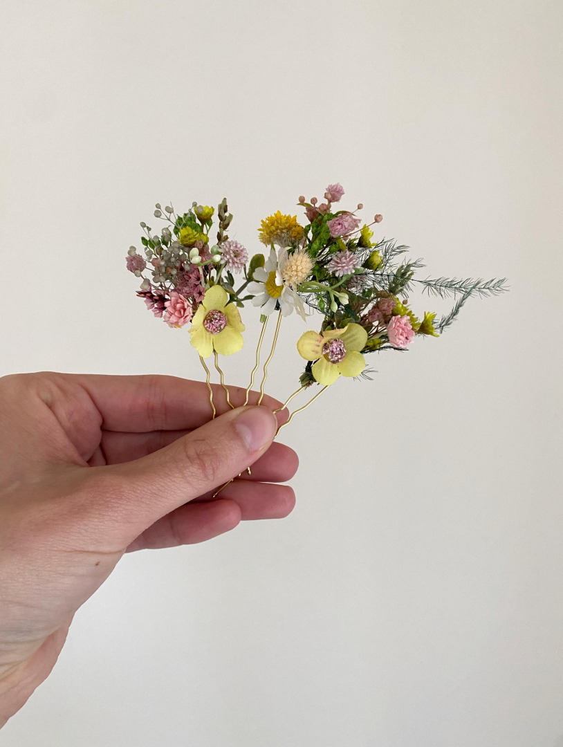 Meadow flower hairpins with wildflowers in yellow and pink tones. Suitable for wedding, prom or for other special occasions. The product is made of artificial and preserved flowers, grass, leaves, and other trinkets used for ...