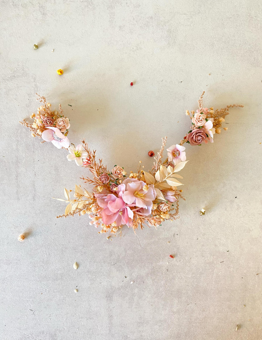 Romantic hair vine with a floral veil for a beautiful boho wedding hairstyle. The hair vine and the veil are mostly made of artificial flowers and preserved materials in pink and cream tones. . . When stored in dry and dark place, our ...