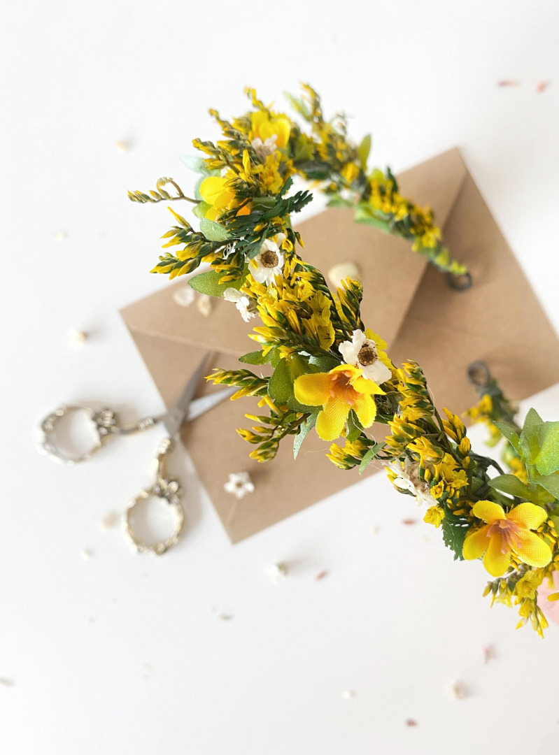 Romantic flower half wreath in yellow tones The flower half wreath is made of artificial/fabric flowers, preserved flowers, leaves, grass and other trinkets used for arranging. When stored in dry and dark place, our products last 10-15 ...
