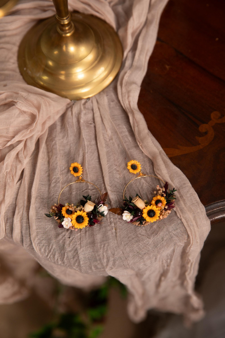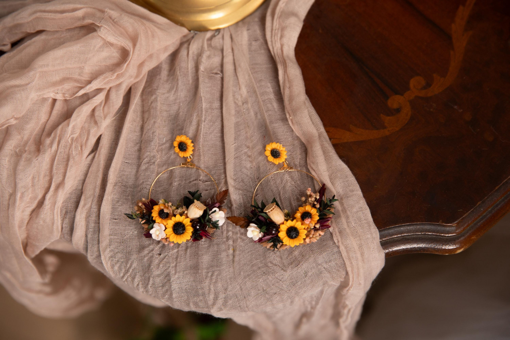 Sunflower circle earrings. In yellow tonesCan be used for weddings, other events or just everyday use. Customisable. The earrings are made of preserved flowers, leaves and grass, wire, and other trinkets used for arranging :)Diameter: ...