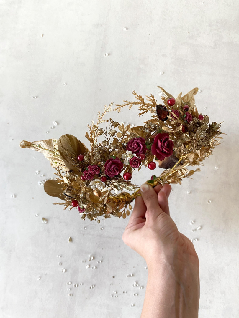 The flower crown is made of artificial leaves, grass, flowers, stones, wire and other trinkets used for arranging.
