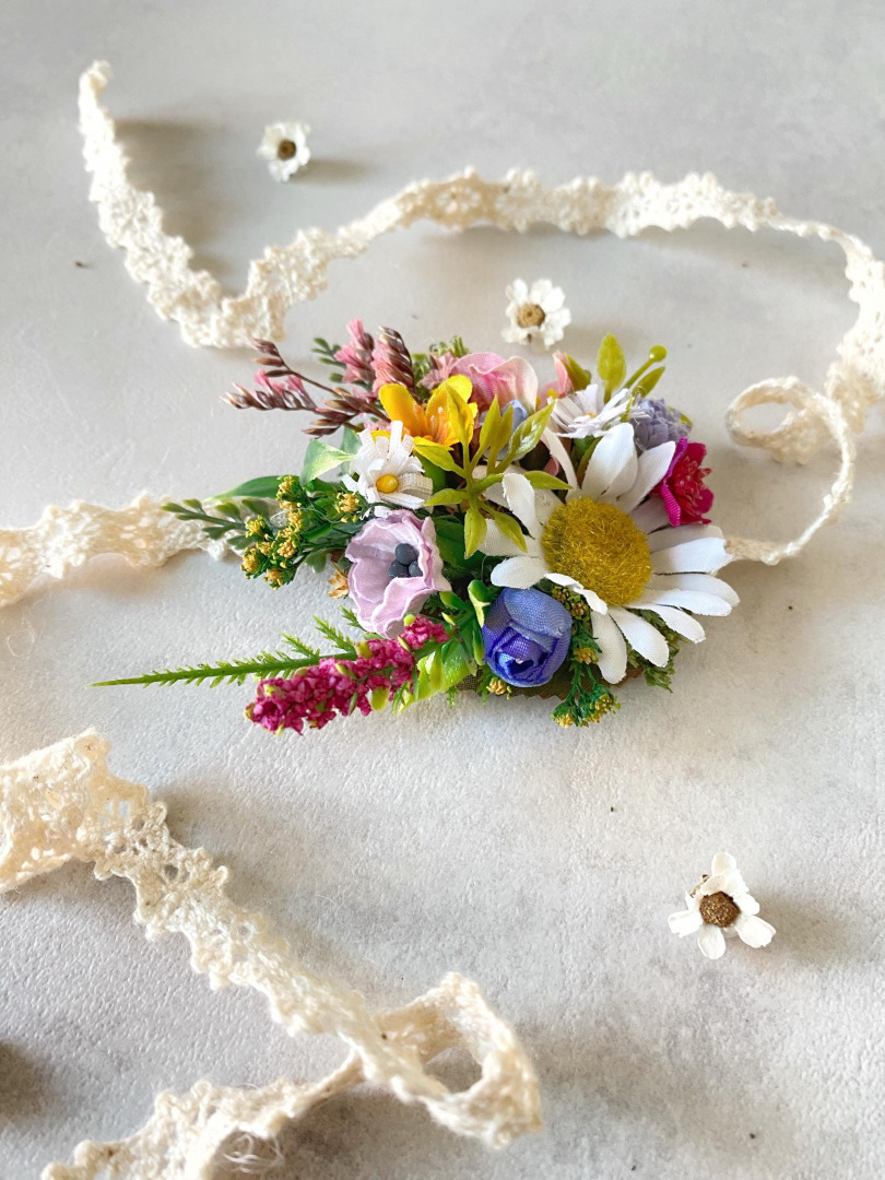 Meadow flower bracelet with daisy. Perfect for weddings or proms and other special events. The flower bracelet is made of artificial and preserved flowers and other trinkets used for arranging. When stored in dry and dark place, our ...