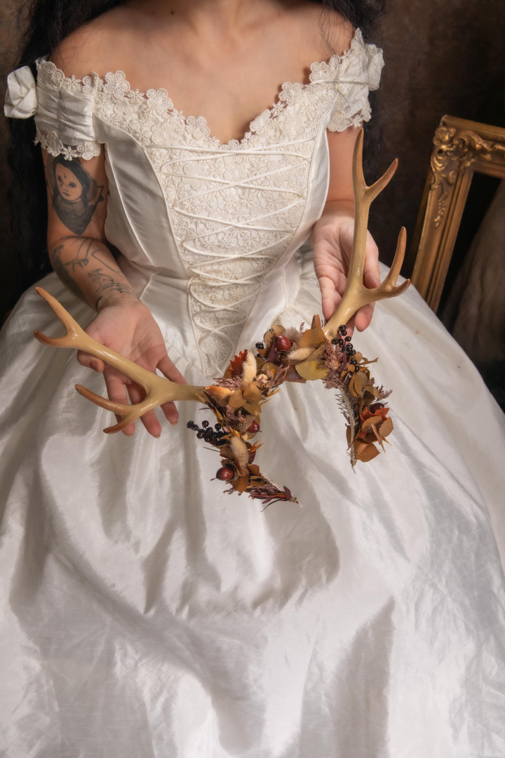 The flower crown is made of artificial and preserved materials, antlers and other arranging material.