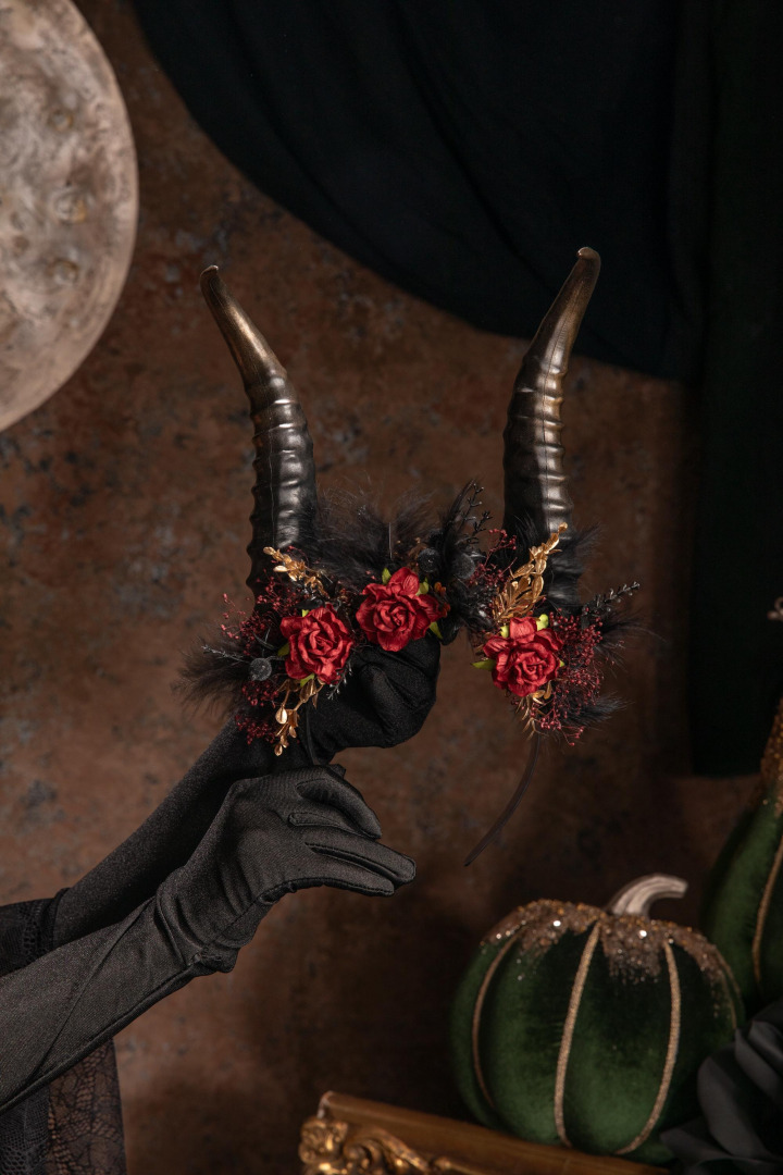 Fantasy pagan flower crown with black horns and red flowers. The flower crown is made of artificial flowers, leaves, grass, horns and other trinkets used for arranging. When stored in dry and dark place, our products last 10-15 years. ...