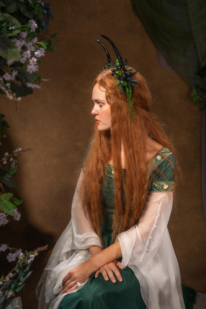 Perfect for PAGAN festival. Flower headband with black horns in woodland greenery design with fern. The flower headband is made of artificial leaves, preserved materials, antlers and other arranging material. When stored in dry and dark ...
