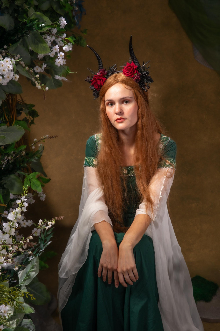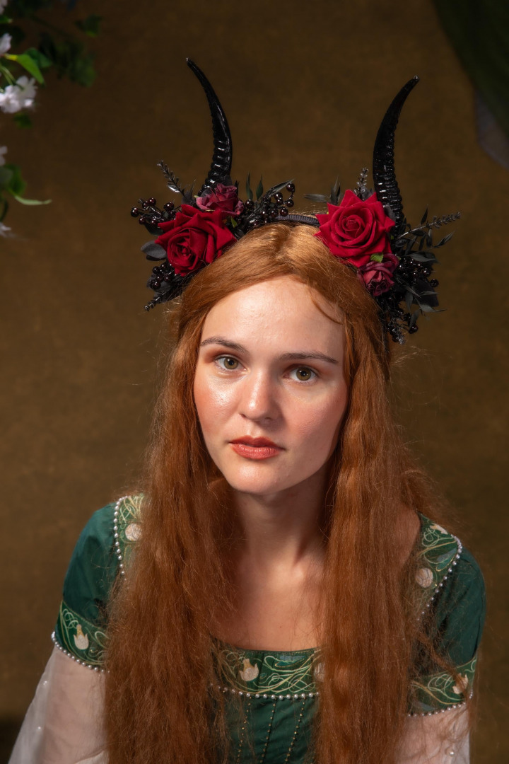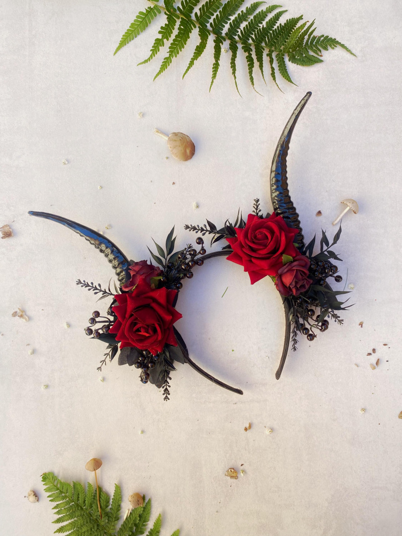 Fantasy pagan flower crown with black horns and red roses. The flower crown is made of artificial flowers, leaves, grass, horns and other trinkets used for arranging. When stored in dry and dark place, our products last 10-15 years. ...