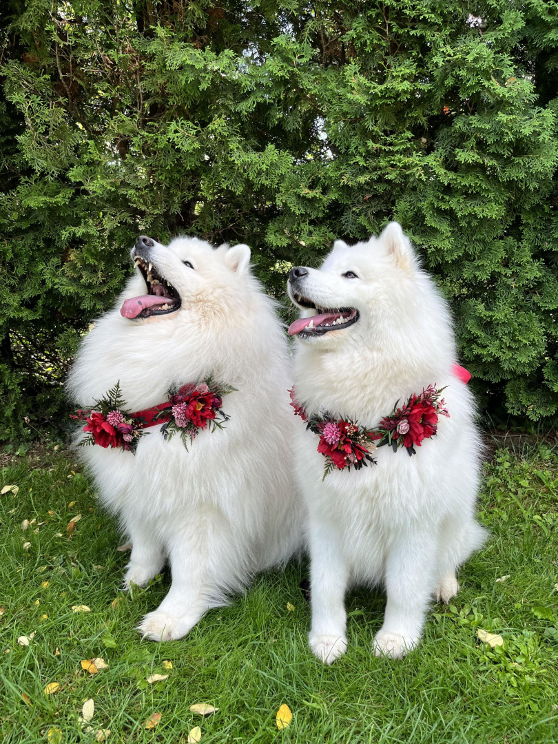 Made of textile flowers, artificial and preserved materials. The base is a ribbon that ties. Two designs to choose from - smaller and larger..., M and L. In our offer you will also find size S for small dog breeds.