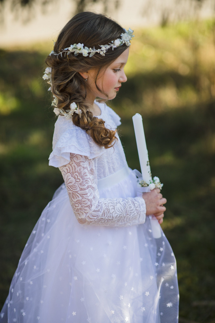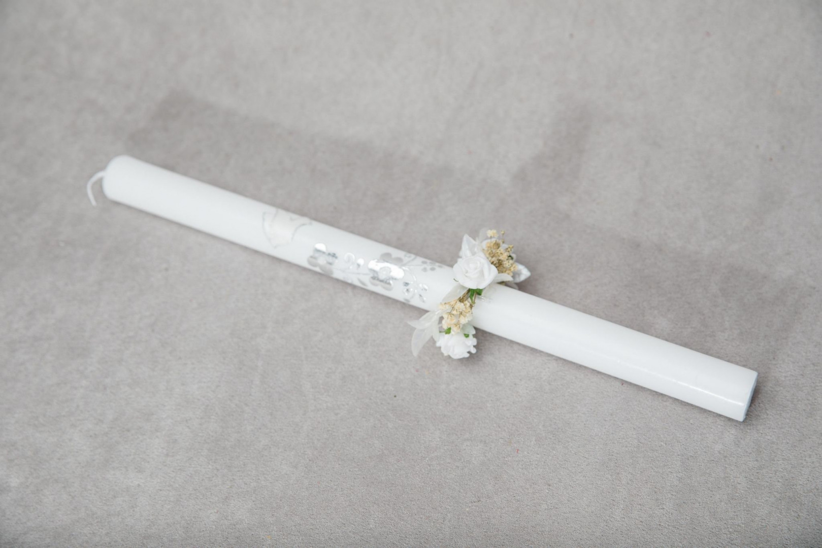 White and ivory flower candle decoration for first holy communion.