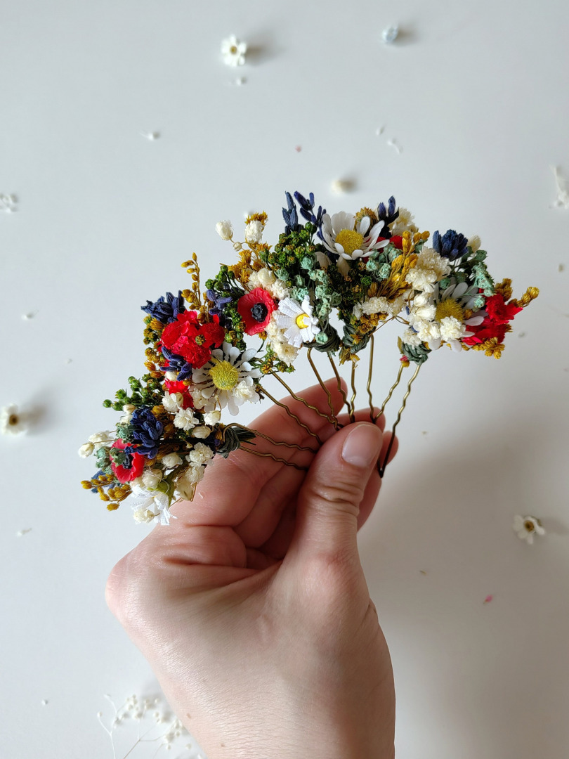 The hair pins are made of artificial flowers, preserved materials and other trinkets used for arranging.