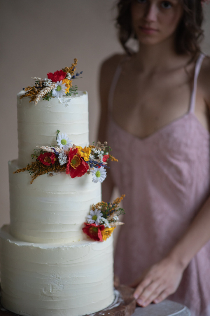 Priemer je 15, 22 a 30 cm Materiál: Ozdoby v troch veľkostiach na svadobnú tortu sú vyrobené z textilných kvetov,lístkov,konzervovaných materiálov a iných drobností určených k aranžovaniu. Spôsob výroby: aranžovanie