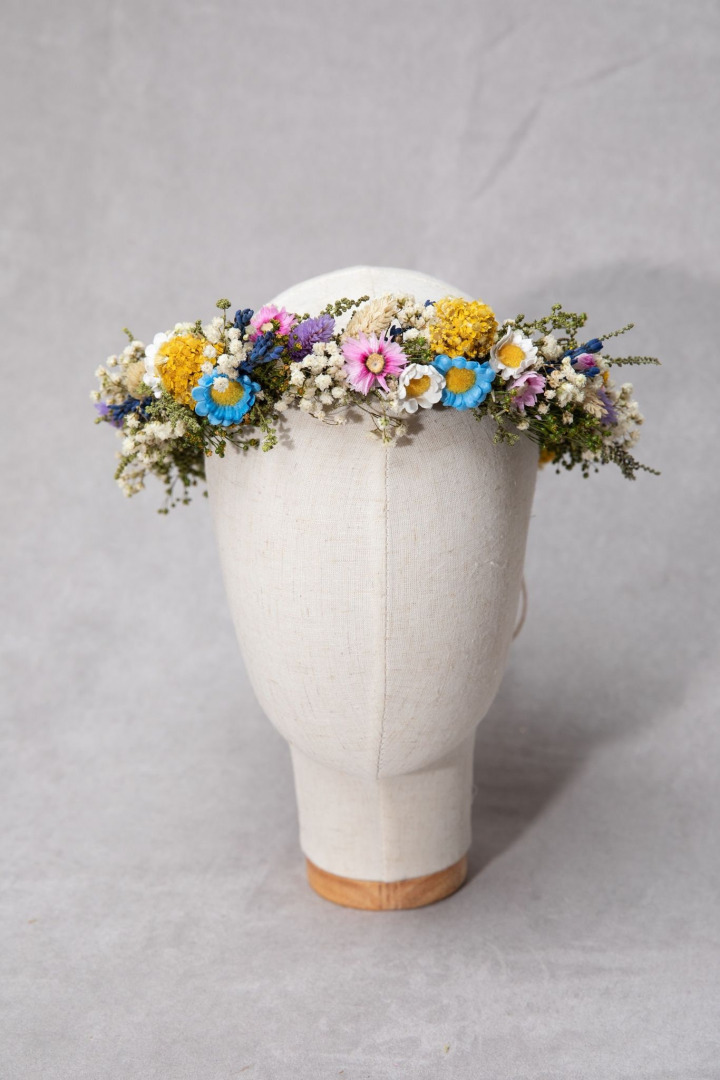 The set consists of headpiece and boutonniere. The accessories are made of fabric/artificial flowers, preserved flowers, leaves and grass and other trinkets used for arranging.