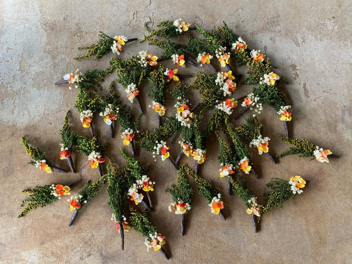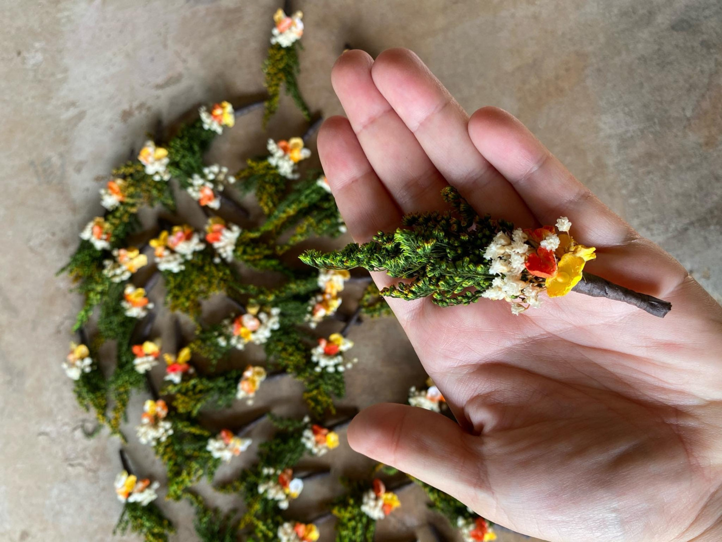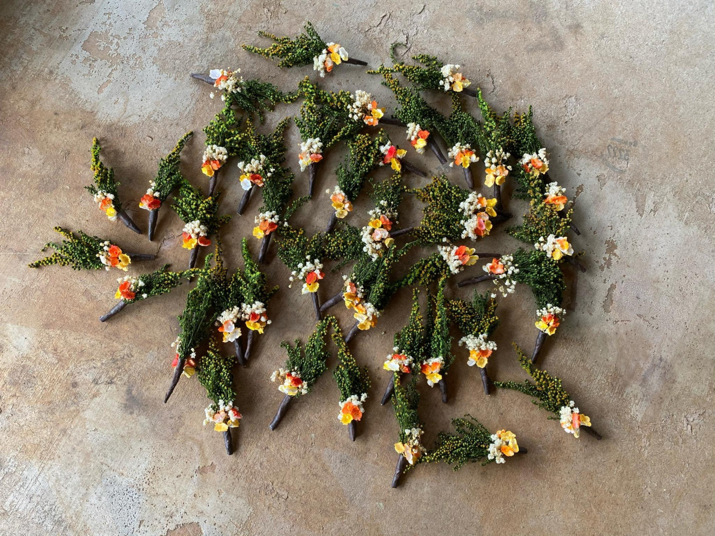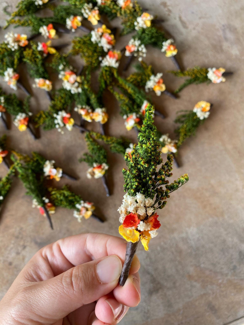 Pierko je vyrobené z textilných kvetov, lístkov, trávy a iných drobností určených k aranžovaniu.