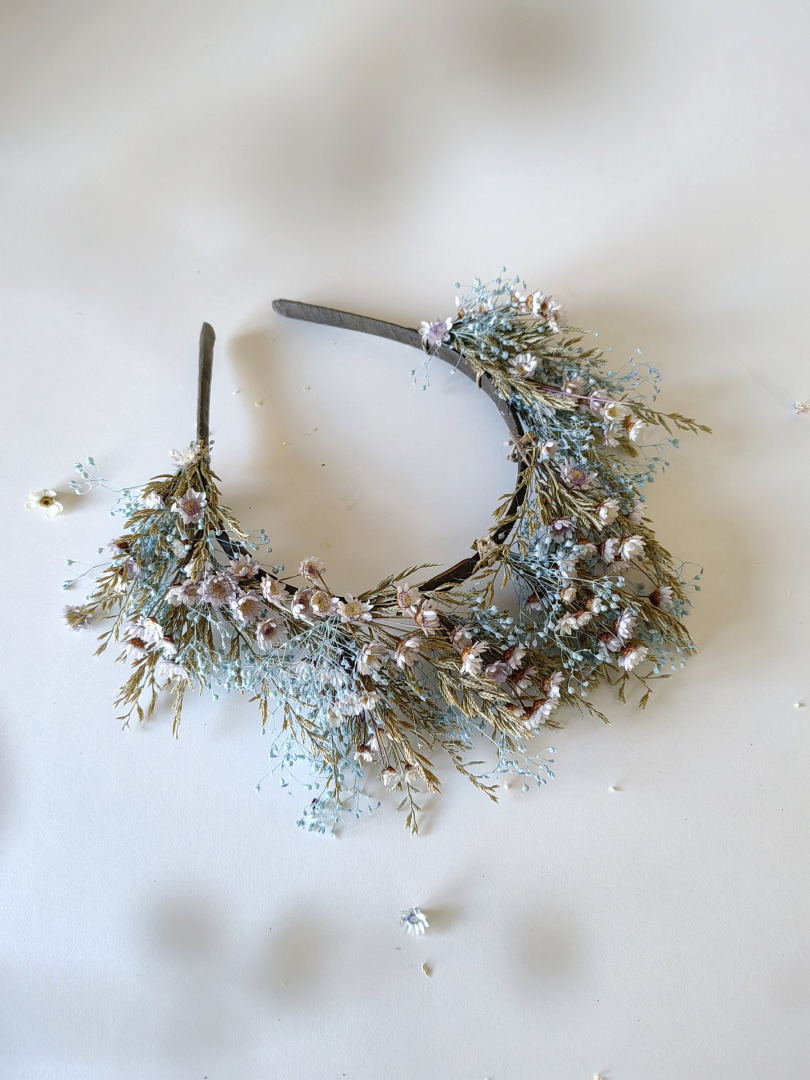 Natural flower crown in romantic fairy design. Baby blue tones. Suitabe for wedding or for proms and other special events.