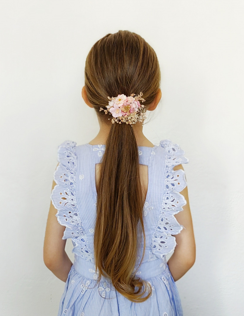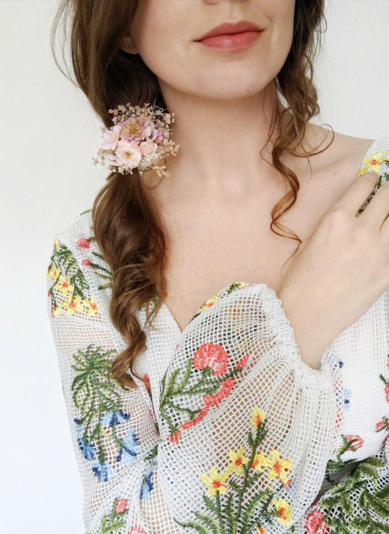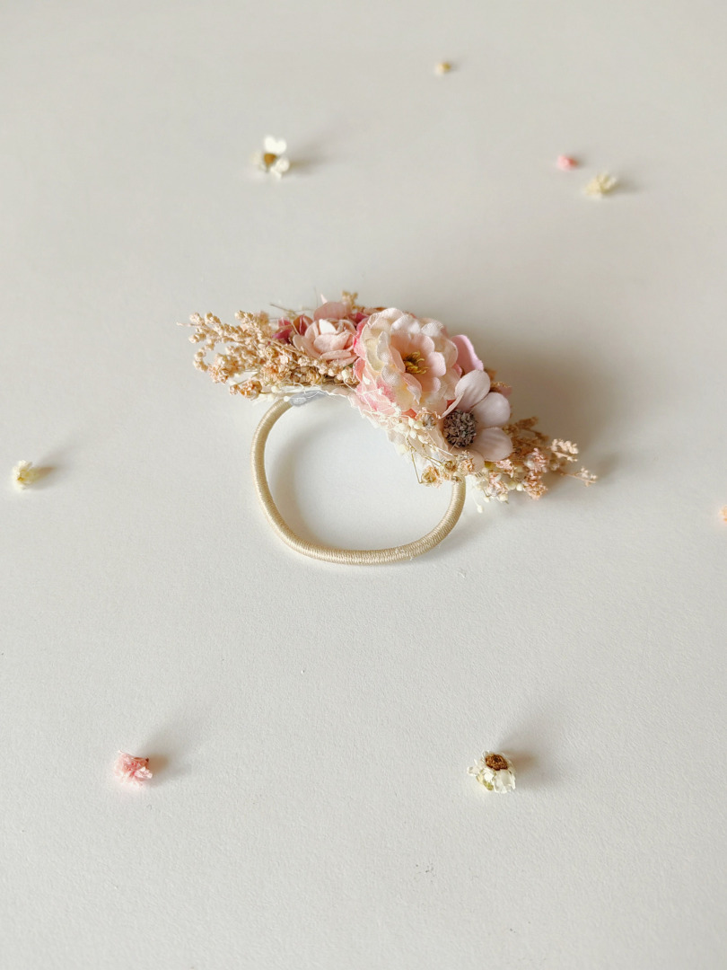 The flower hair tie is made of artificial flowers, leaves, grass, preserved material and other trinkets used for arranging.