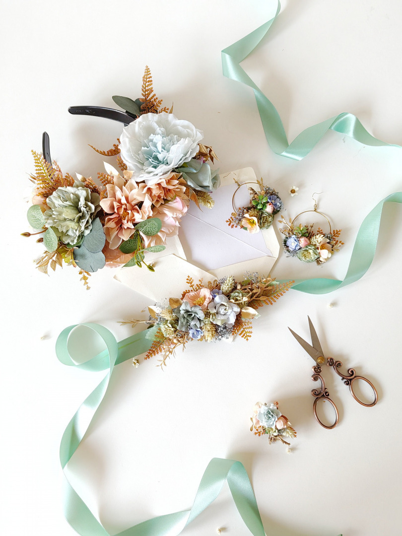 Čelenka je vyrobená z textilných kvetov, lístkov, trávy a iných drobností určených k aranžovaniu.