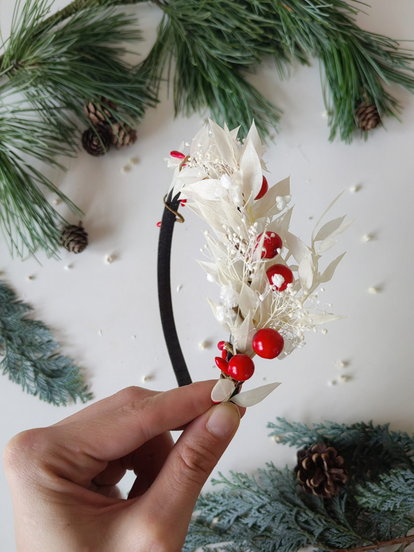 Čelenka je vyrobená z ruskusových ístkov, aranžérskych bobúľ a iných drobností určených k aranžovaniu.