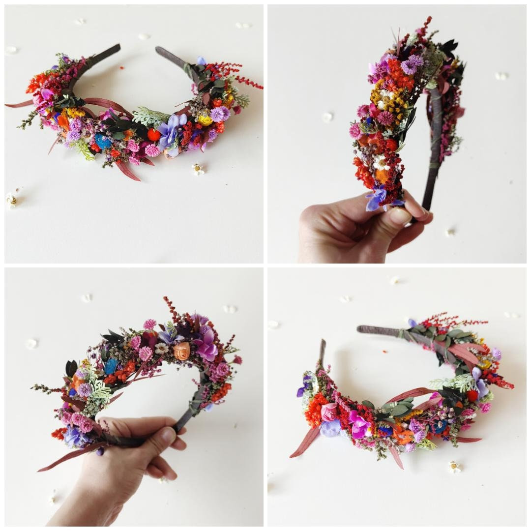 Kvetinový venček s lúčnymi kvetmi v pestrofarebnom boho dizajne. Veľkosť je univerzálna, venček sa viaže a prispôsobuje viazaním stuhou v zadnej časti.