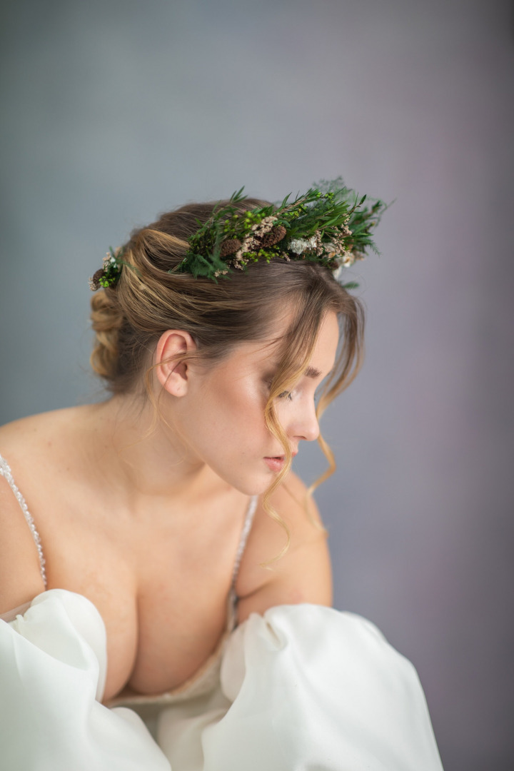 Romantic bridal hair crown in woodland design wit pine cones...