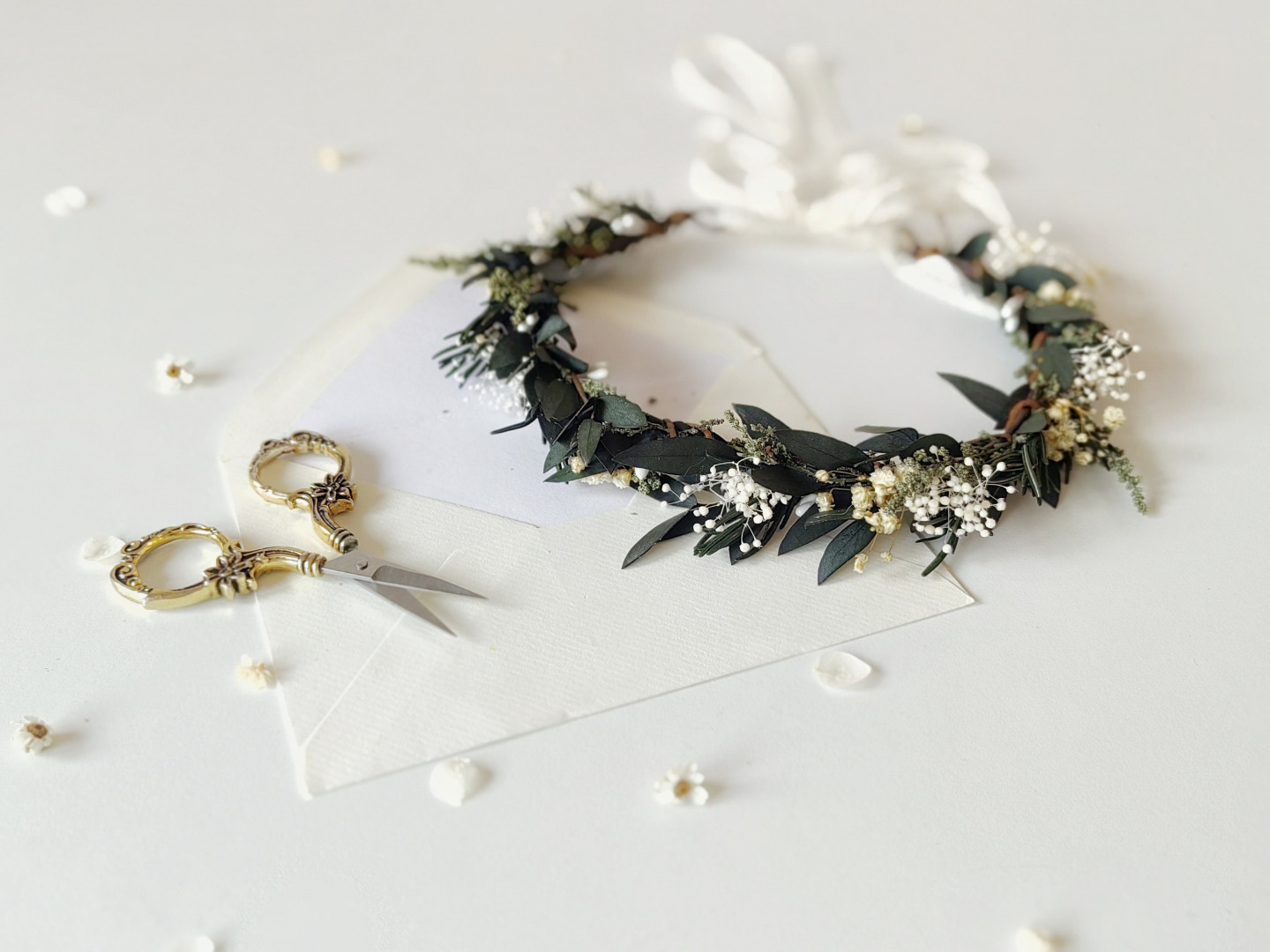 The set is made of preserved leaves of eucalyptus, olive tree, gypsophila and rosemary and other trinkets used for arranging :)