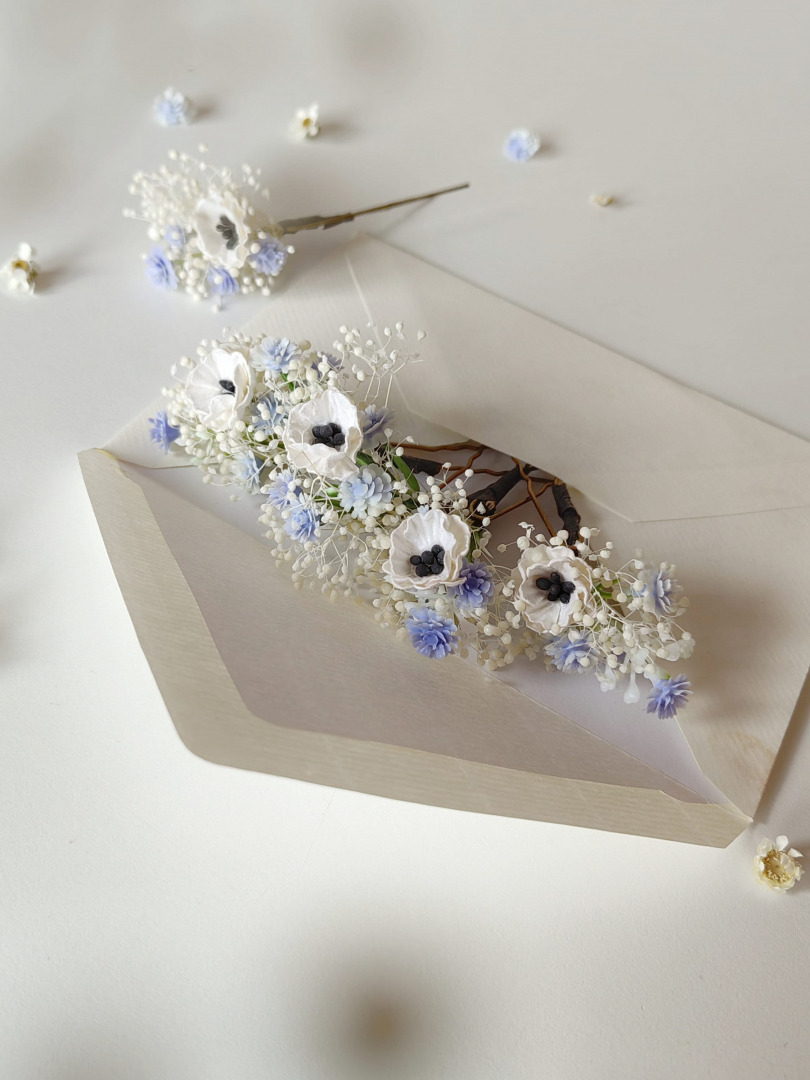 Handmade wedding hairpins are made of artificial baby's breath and and anemone flowers, preserved flowers and other trinkets used for arranging :) They are fragile!