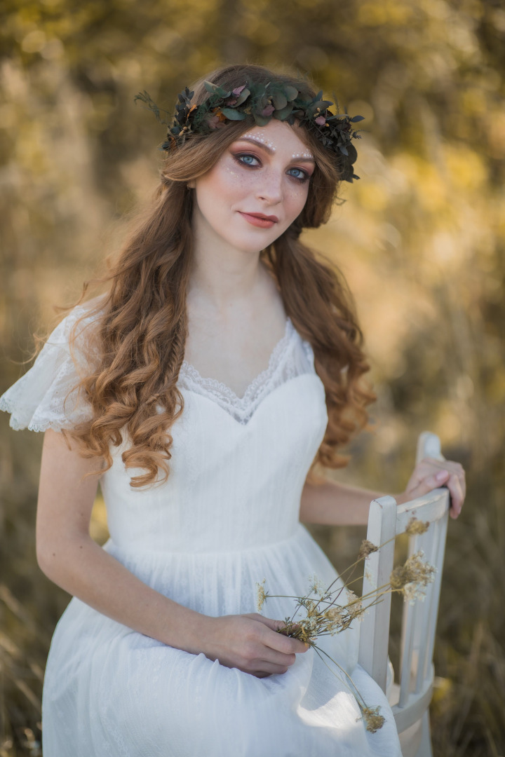 The flower crown is made of preserved leaves and flowers, wire, floristic tape and other trinkets used for arranging.