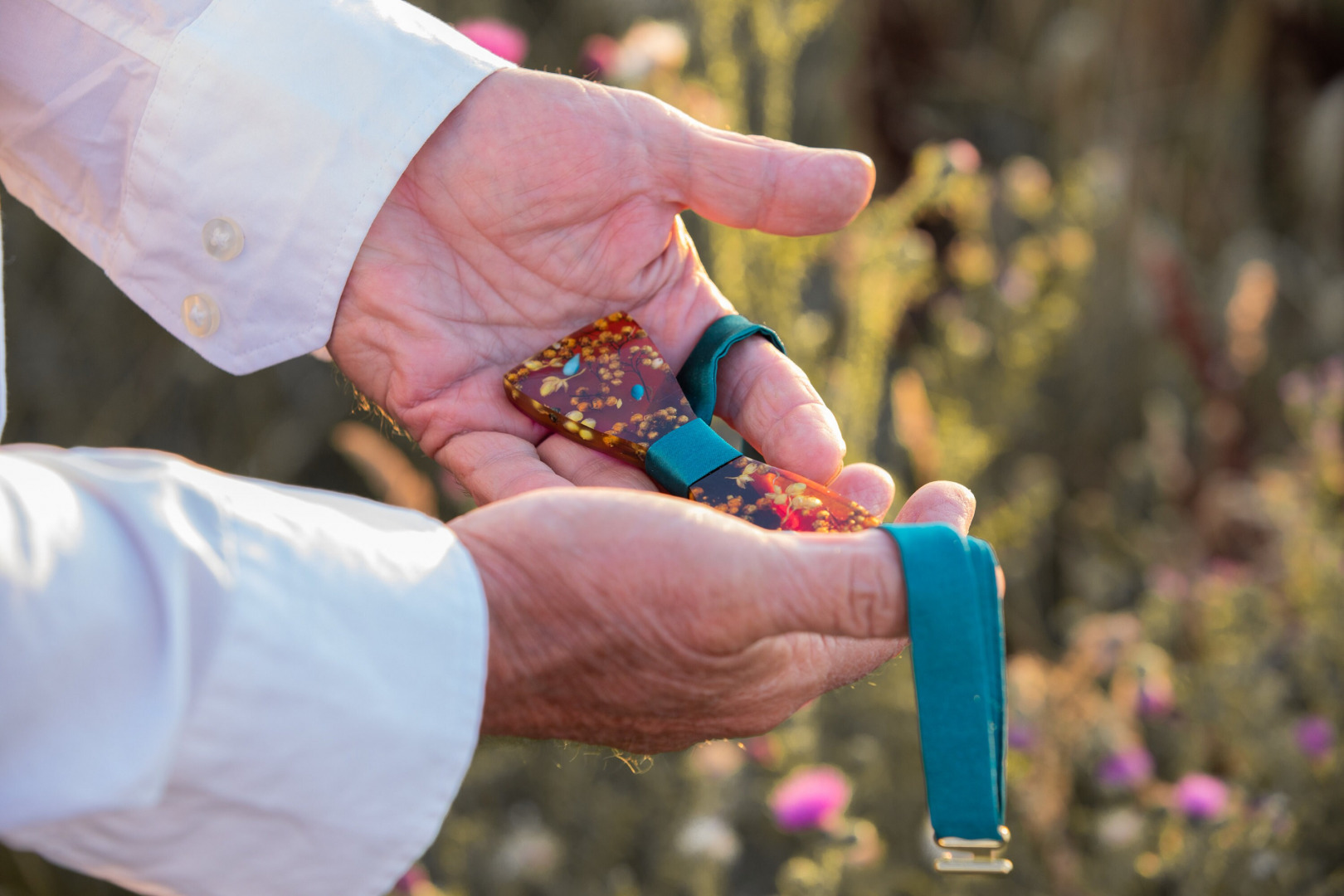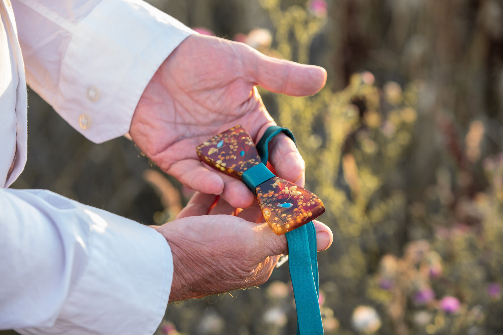 Ručne robený živicový motýlik s kvetmi z našej dielničky. Môže sa kombinovať aj s drevom. Viazanie je kvalitne šité a nastaviteľné, farba viazania sa dá prispôsobiť. V prípade, ak motýlik nie je skladom, doba výroba je 2-3 týždne.