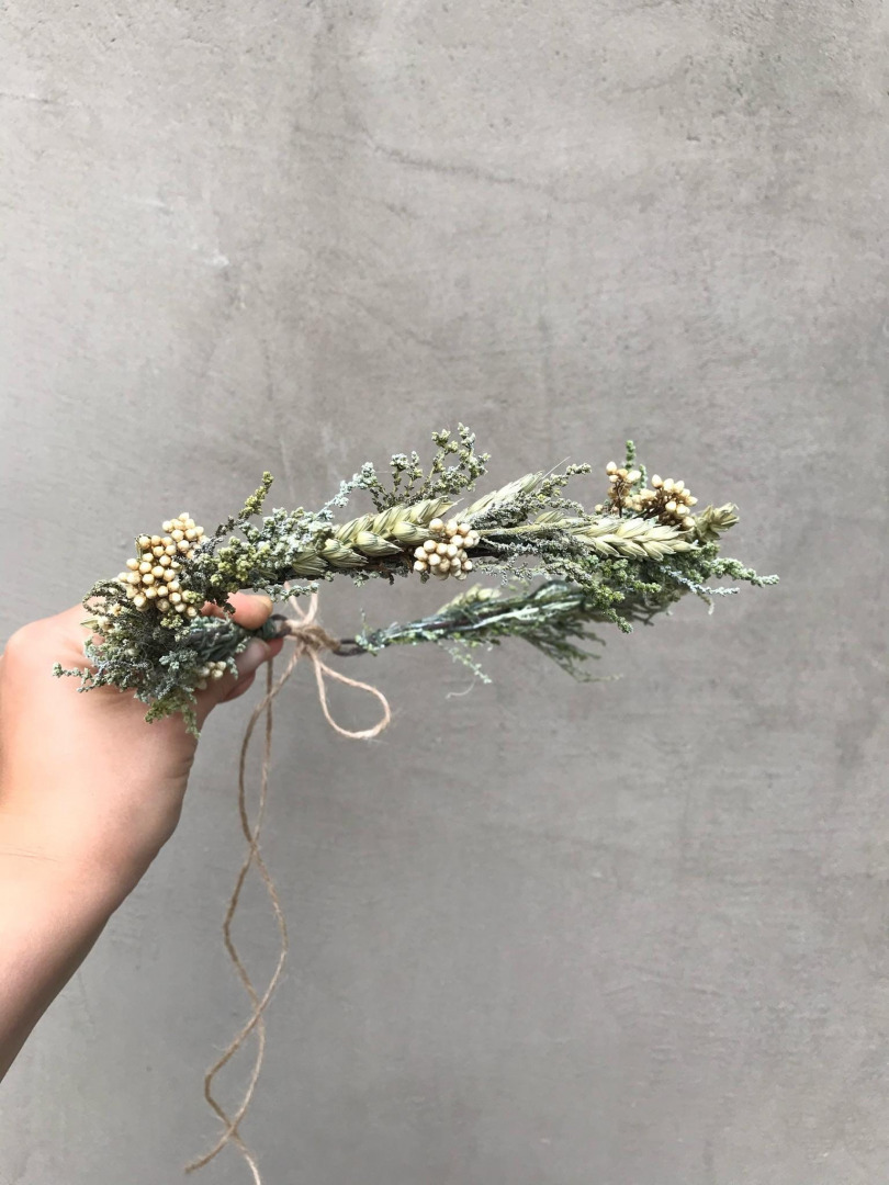 Kvetinový venček v greenery štýle. Obvod venčeka je 48-53 cm. Veľkosť je univerzálna, venček sa viaže a prispôsobuje viazaním stuhou v zadnej časti.
