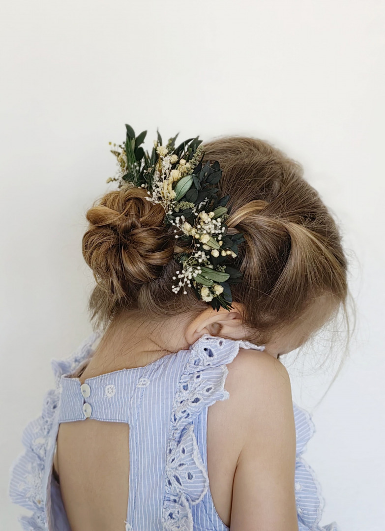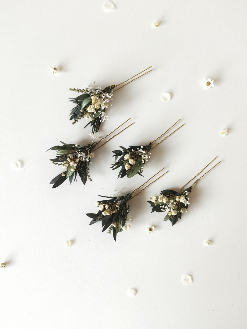 The flower hair pins are made of preserved eucalyptus and olive leaves, baby's breath, rosemary and floristic tape.